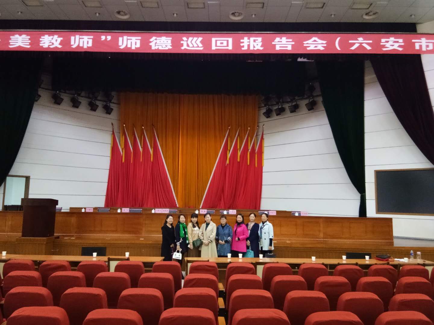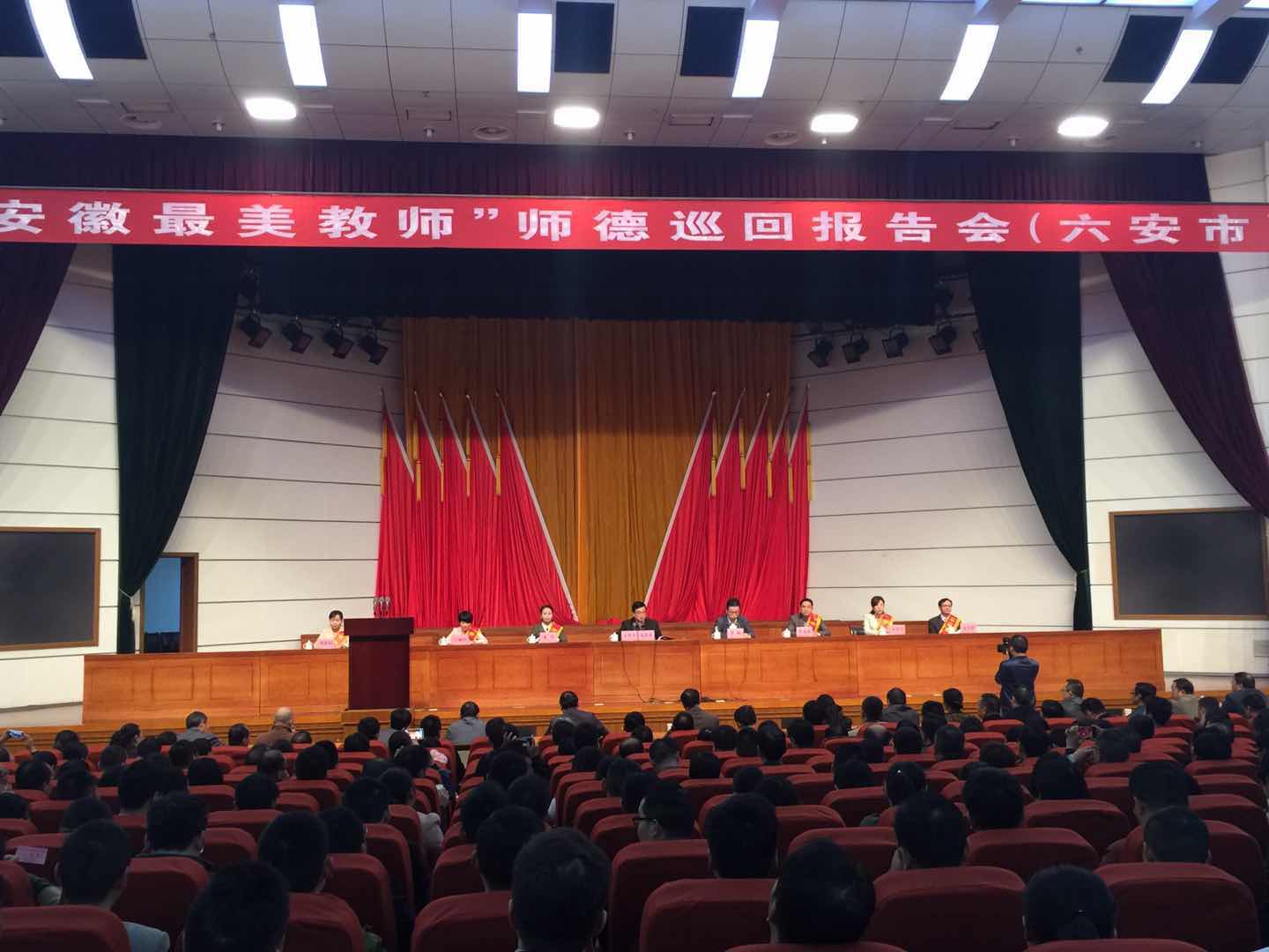 10月18日下午, 在校工会王成怡主席的带领下,我校10名教师参加了“安徽最美教师”师德巡回报告会(六安市)。六安市教育局局长夏跃武主持了此次报告会。