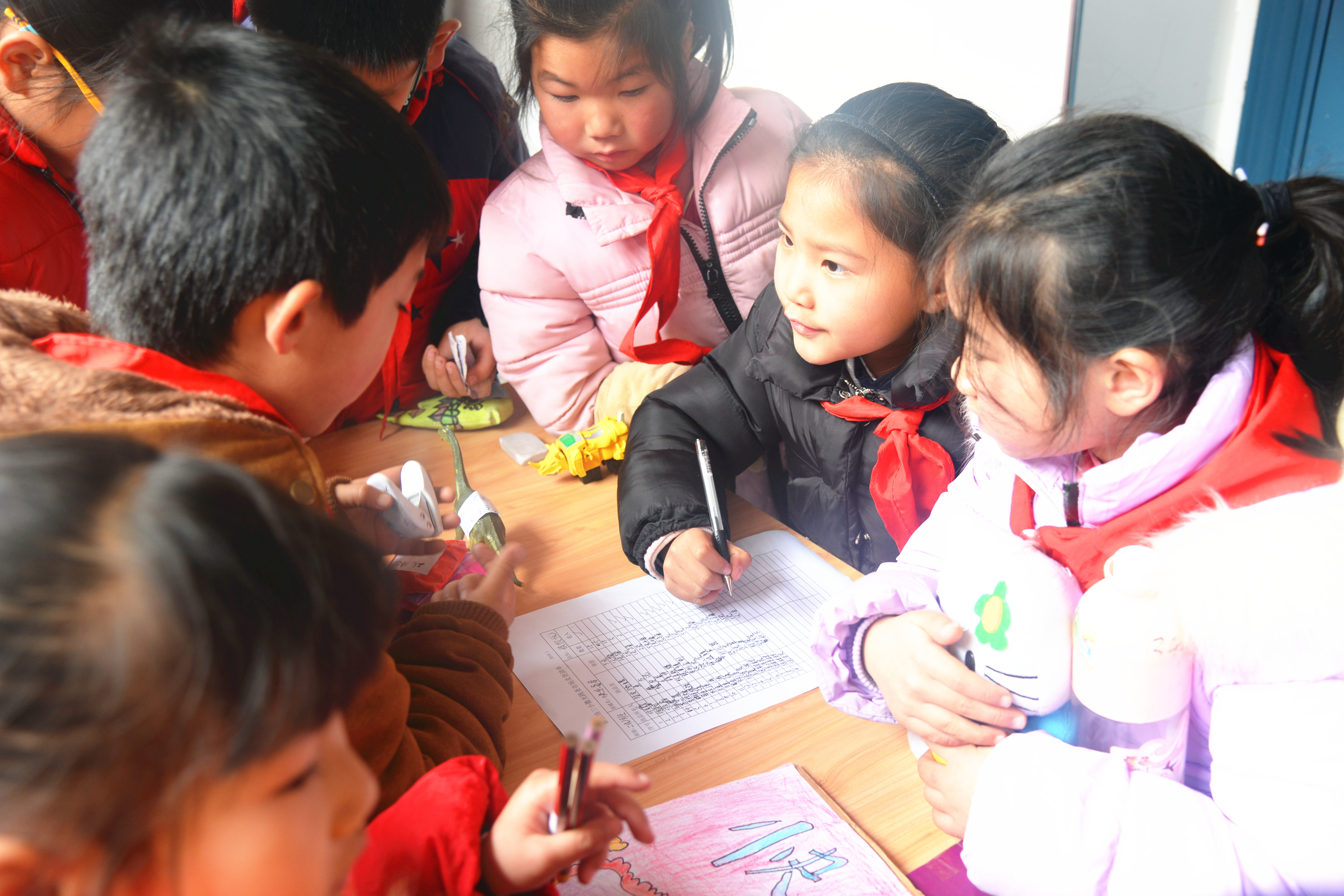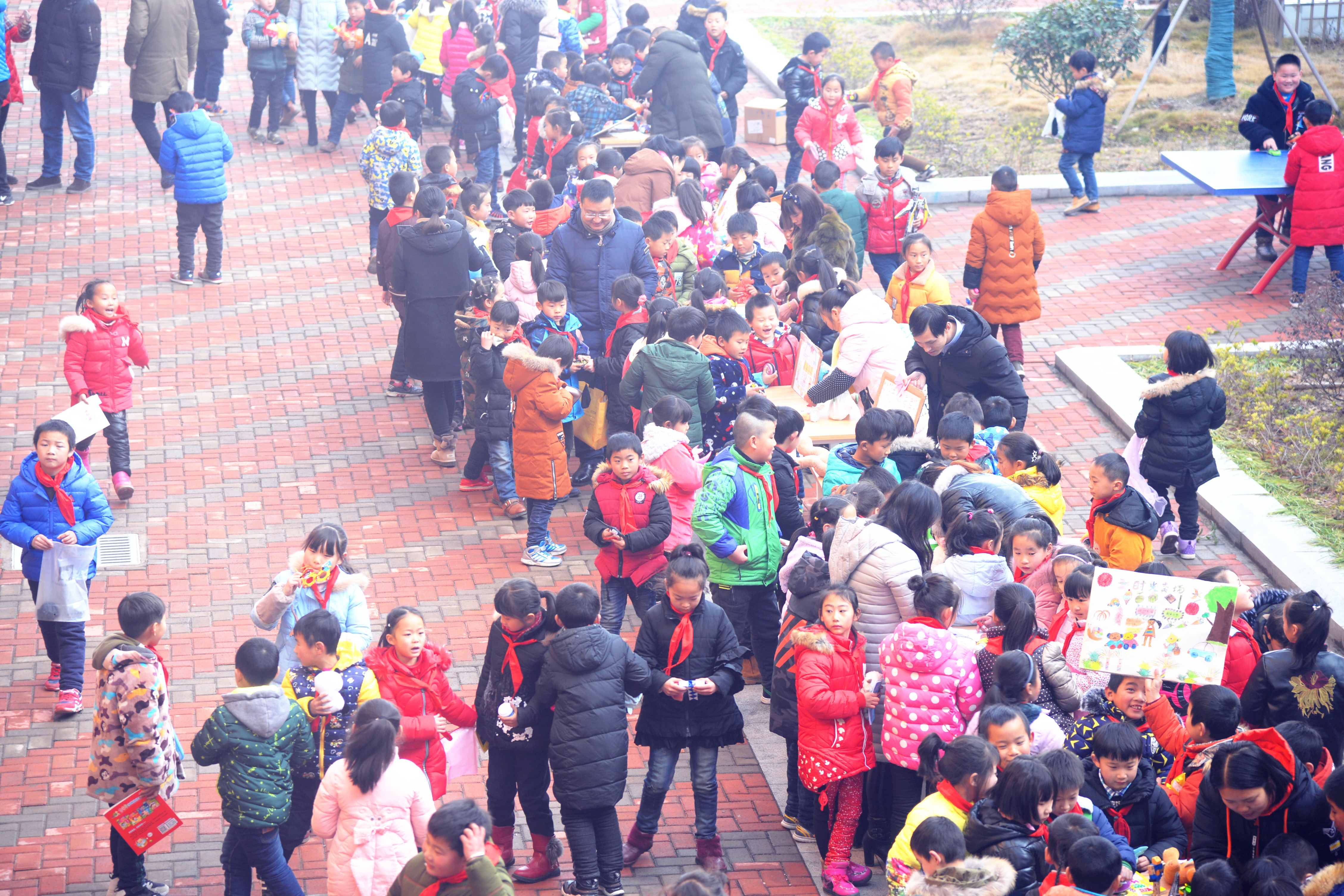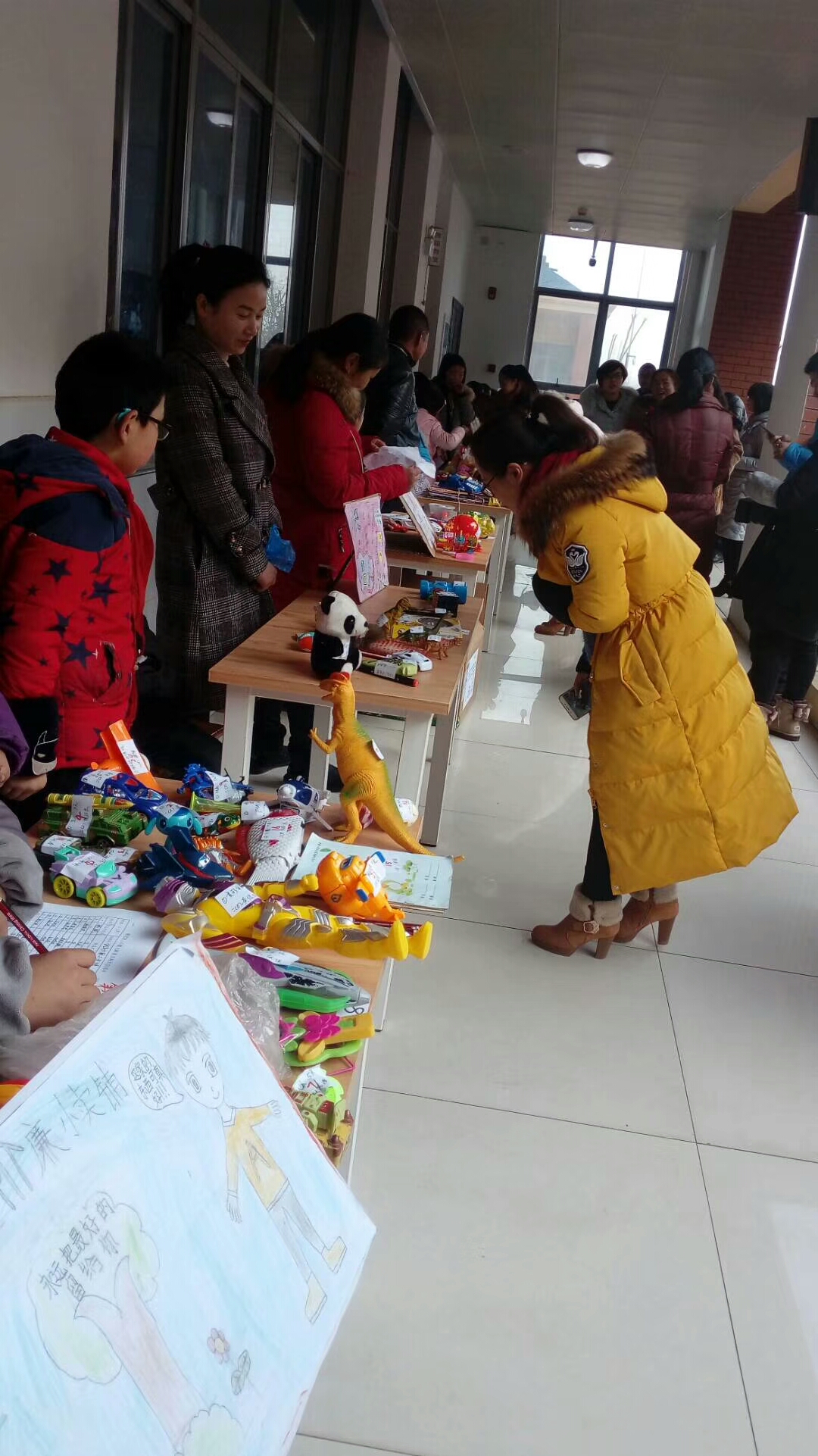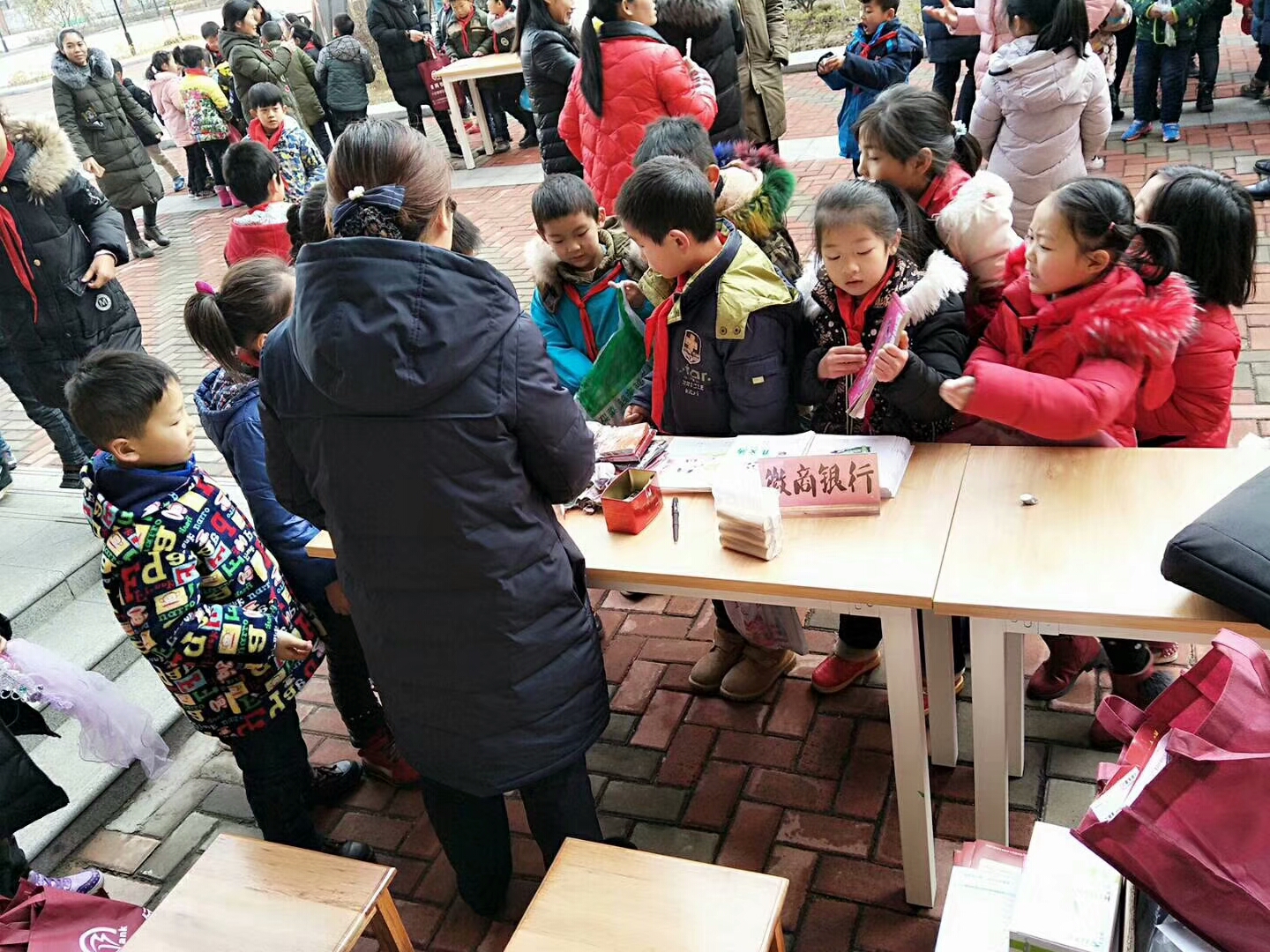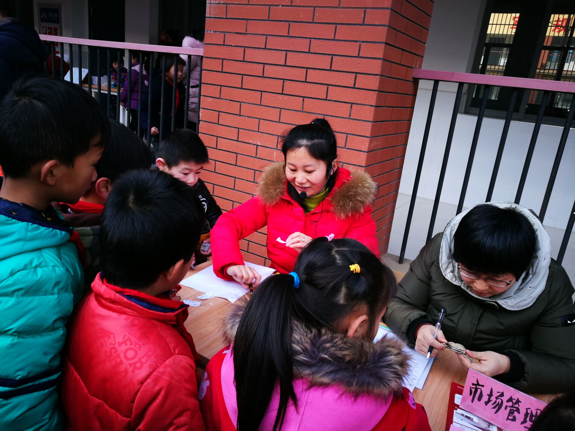 2018年1月19日下午2.20分二年级组八个班级24位组长手举店铺海报带领小组成员抱着装满物品的纸箱准时来到学校准备好的地点布置自己的小商铺。每个小商铺都有一位家长志愿者帮忙,孩子们分工合作挂海报、摆物品、轻点数目、查看清单都有条不絮的进行。为了使市场规范有序,所有商品都是统一标签,明码标价,活动后方还设置了市场管理处,校少先大队也专门安排人员来维持秩序,同时我们还得到了徽商银行的鼎立赞助,银行工作人员给孩子们准备了兑换的零钱和精美的礼品。2.40分在所有师生的期待中“徽光跳蚤市场”开市了,同学们拎着自己的零钱包在班主任老师的带领下有序的进入卖场,首先各式各样精美的海报就吸引了所有同学的眼球,再看琳琅满目的商品真让人眼花缭乱,震撼持续了几秒孩子们就快速转向自己看中的物品,问价、付钱、找零、记账情景在每个店铺前上演,热闹的跳蚤市场还吸引了众多其他年级的老师,看到这么多物美价廉的宝贝老师也忍不住出手淘宝了。开市没多久多数店铺的商品就销售的差不多了,再看孩子们的表情,满脸笑容的肯定是淘到了心仪的宝贝,一些孩子因为自己的物品价格较高赶紧跑到市场管理处进行价格调换,最后卖完商品小组成员还不忘对着清单核对总账。一个多小时的模拟购物活动在轻松愉快的氛围中结束了。