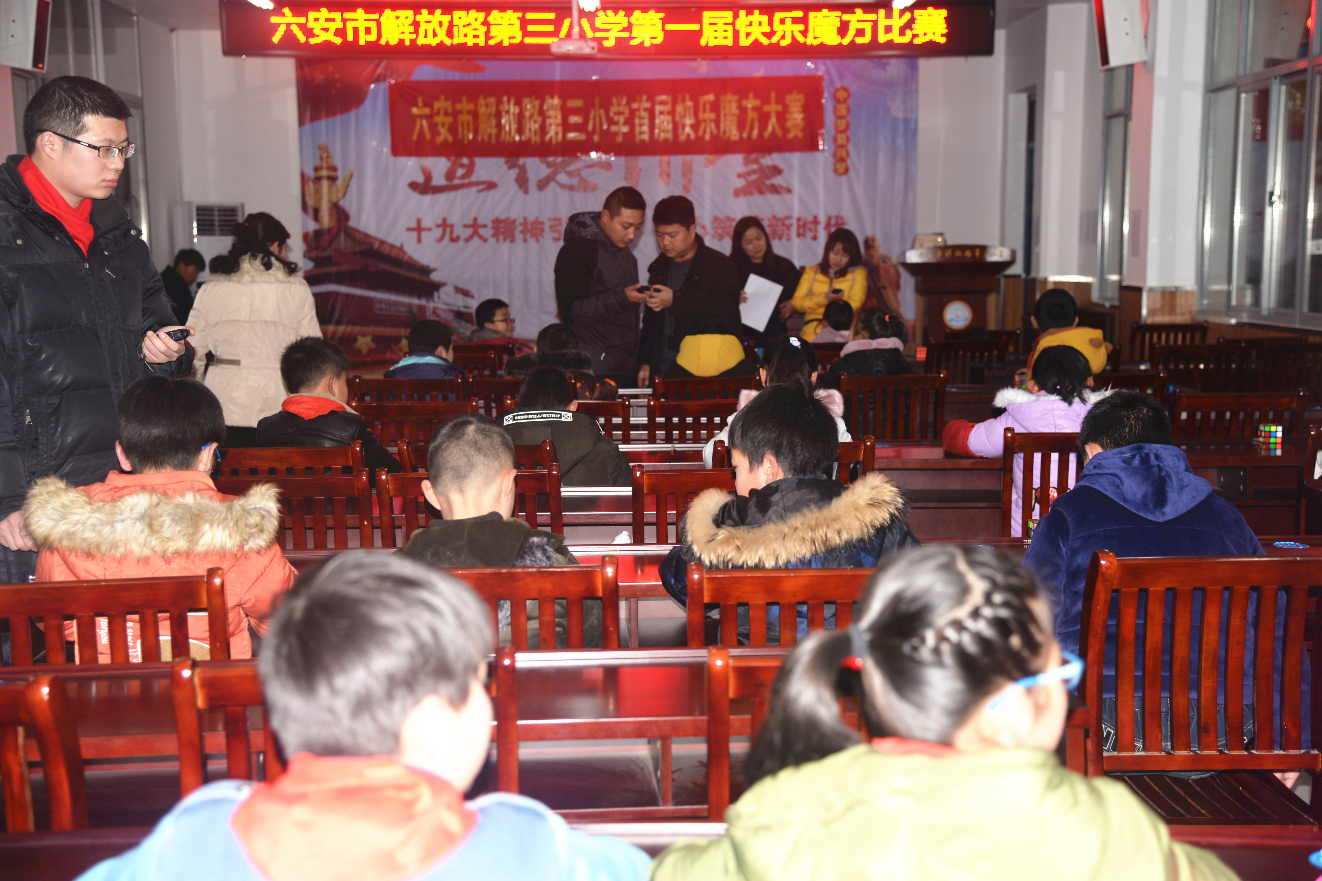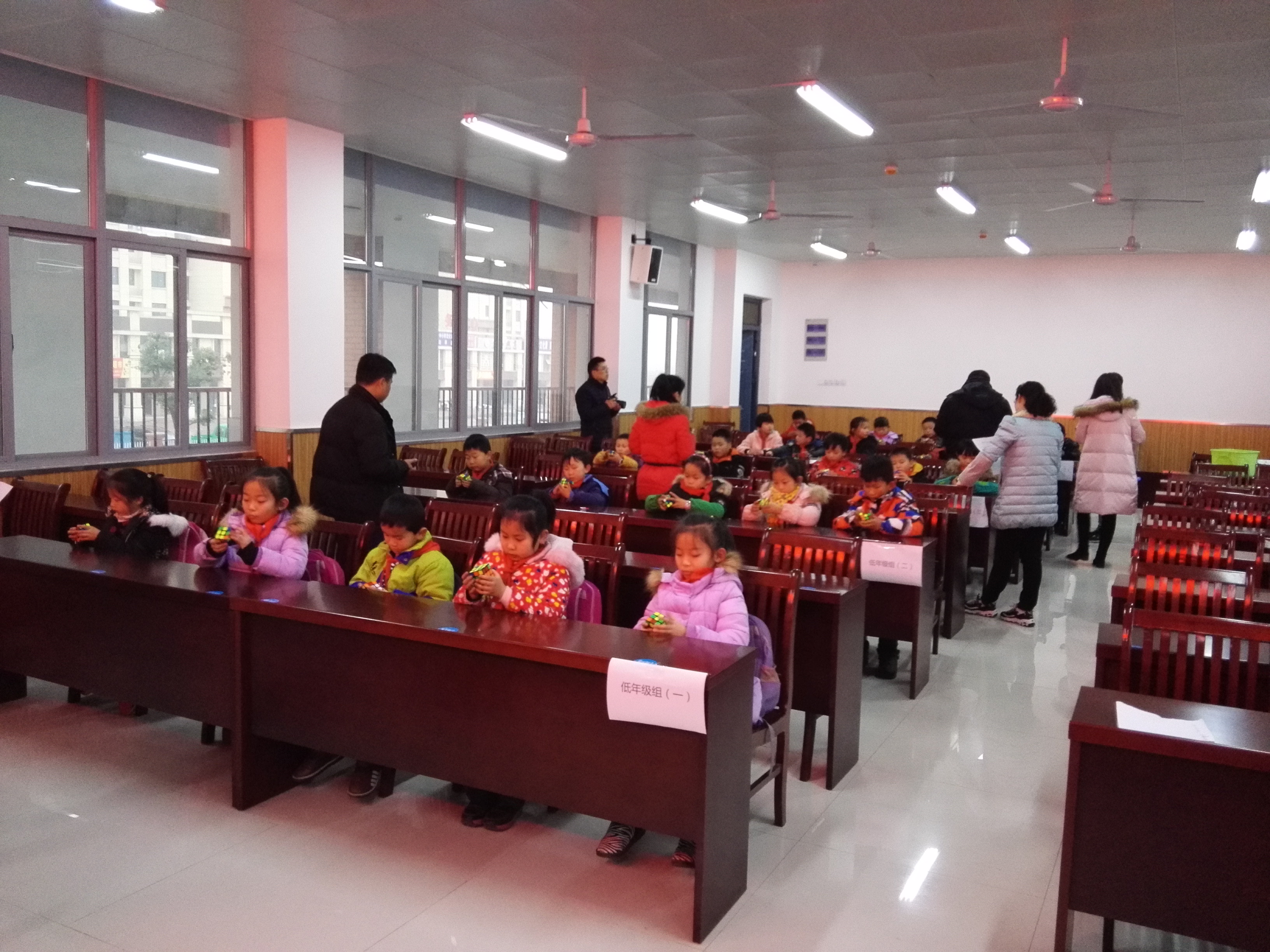 此次魔方大赛分为低年级组(二年级)和高年级组(三至六年级),经过初次选拔,77名低年级选手和34名高年级选手进入决赛。在决赛中每位选手共比赛三次,分别在五分钟内将打乱的魔方还原,三次计时后取平均成绩。经过激烈的角逐,最终产生冠亚季军。